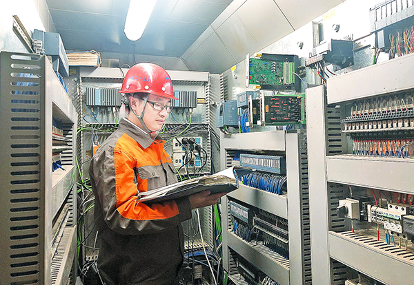 蔡文輝在對盾構機進行電氣檢修(孫兆偉 攝)