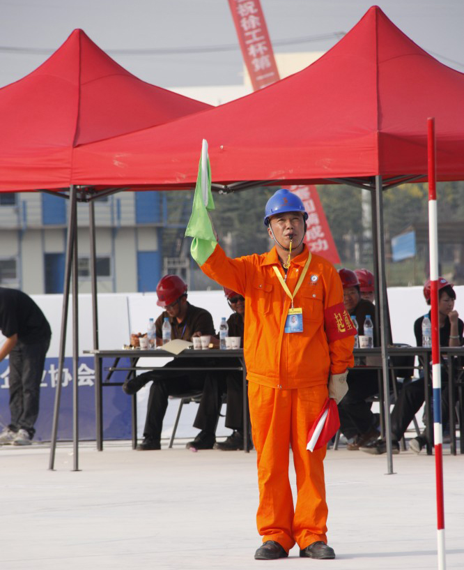 變幅、起落鉤、擺桿……正式比賽現(xian)場,指(zhi)揮(hui)(hui)的(de)哨子(zi)清(qing)脆響(xiang)亮、吊(diao)裝(zhuang)指(zhi)揮(hui)(hui)手中的(de)紅(hong)旗和綠旗不斷變化著動作(zuo),280噸履(lv)帶吊(diao)長長的(de)臂桿,吊(diao)著重(zhong)達15噸的(de)履(lv)帶,穩穩地穿過了最后兩根標(biao)志桿,準確地安放到指(zhi)定(ding)位置。
