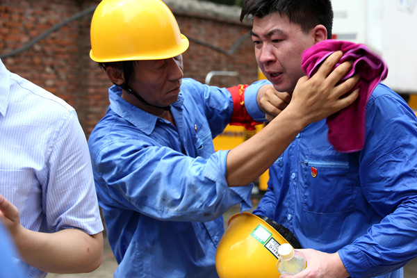 河(he)北石家(jia)莊供電公(gong)司(si)帶(dai)電作業班班長張全勝為剛作業完的工作人員擦(ca)拭汗水。