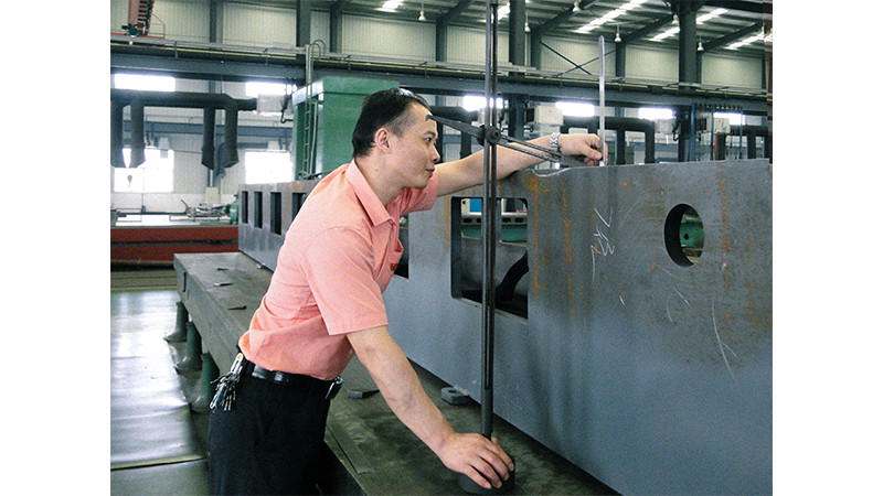 “呲……呲……”在國(guo)機集(ji)團所屬(shu)恒天集(ji)團常(chang)德紡織機械有(you)限公(gong)司(以(yi)下簡稱“常(chang)德紡機”)大件車間,每天都會發出這一陣陣金屬(shu)摩擦的聲音。車間里(li),有(you)兩塊十幾平(ping)米的大型平(ping)板(ban),平(ping)板(ban)一角(jiao)擺放著(zhu)各(ge)種(zhong)給毛坯零件劃(hua)線用(yong)的工(gong)、量具。鉗工(gong)技(ji)師(shi)韓昌勇熟練地(di)操(cao)弄著(zhu)各(ge)種(zhong)測量工(gong)具,不停地(di)為各(ge)種(zhong)型號的毛坯零件劃(hua)上一道(dao)道(dao)泛(fan)著(zhu)金屬(shu)白(bai)光(guang)的“精準線”,為下道(dao)機加(jia)工(gong)程(cheng)序做(zuo)好前置準備。