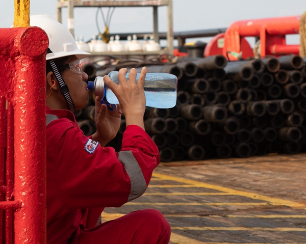 40分鐘后,拖輪抵達潿洲6-8井口。“三條(tiao)樁腿、兩(liang)個人”,是6-8平(ping)臺(tai)(tai)的固定配置。平(ping)臺(tai)(tai)長朱(zhu)(zhu)云洪和操作(zuo)工梁康(kang)(kang)海(hai)里里外外張羅著平(ping)臺(tai)(tai)上的大小事(shi)務,為即將登上平(ping)臺(tai)(tai)工作(zuo)的員工做(zuo)著各項準備。吊(diao)裝(zhuang)作(zuo)業、簽發人員作(zuo)業許可(ke)證、輸(shu)送淡水,朱(zhu)(zhu)云洪和梁康(kang)(kang)海(hai)配合著,一上午,兩(liang)人連喝(he)水的工夫都(dou)沒有。