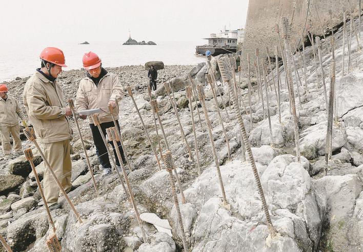 國家電網供電員工在花崗巖上打入鋼筋錨釘