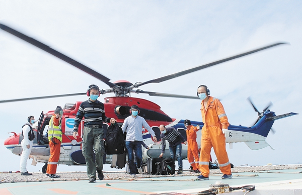 圖為2月15日,西江油田迎來疫情發生后第一批經過14天醫學觀察并取得出海健康憑證的員工