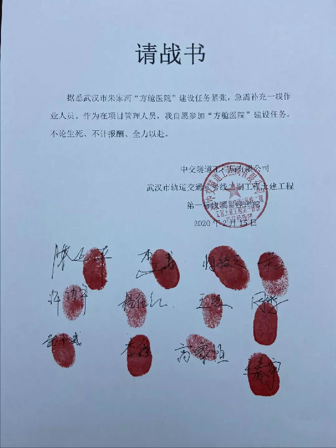 80后項目經理、黨(dang)(dang)員(yuan)陳延平(ping)立(li)(li)即召(zhao)開全體人(ren)(ren)員(yuan)會議,“特殊時期,大家已連(lian)續(xu)奮(fen)戰多(duo)天(tian),但(dan)‘前線(xian)’急需支援,項目成(cheng)立(li)(li)青(qing)年突擊隊(dui),自(zi)愿報(bao)名,我是黨(dang)(dang)員(yuan),我報(bao)名。”“我是黨(dang)(dang)員(yuan),我先(xian)上!”青(qing)年黨(dang)(dang)員(yuan)王春宇(yu)第一個請(qing)戰,不(bu)到5分鐘,由12名平(ping)均年齡(ling)不(bu)到30歲青(qing)年人(ren)(ren)組成(cheng)的突擊隊(dui)組建(jian)完成(cheng)。出征前,突擊隊(dui)員(yuan)立(li)(li)下《請(qing)戰書(shu)》:我自(zi)愿參加“方艙醫院”建(jian)設任(ren)務(wu),不(bu)論生死(si),不(bu)計報(bao)酬、全力以赴,請(qing)戰書(shu)上12個親筆(bi)簽名和鮮紅指(zhi)印,見證著隊(dui)員(yuan)們(men)的青(qing)春擔(dan)當和必勝(sheng)決心。