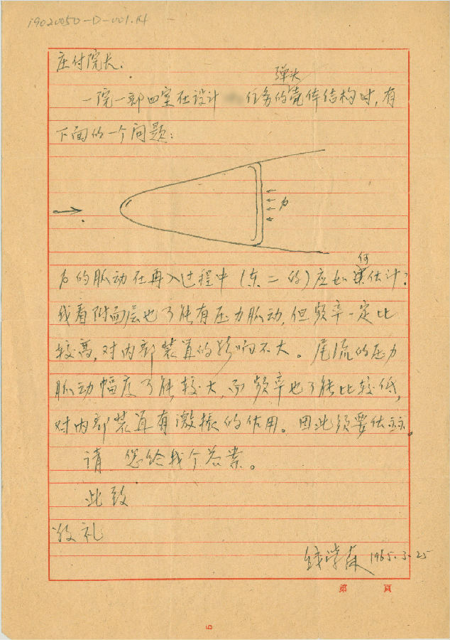 1965年,一院一部四室在某型號任務的彈頭殼(ke)體(ti)結構設計過程中遇(yu)到(dao)了“壓力(li)脈(mo)動(dong)”等具體(ti)問(wen)題需要解(jie)決。同年3月25日,七機(ji)部副部長(chang)錢學森(sen)寫信至七機(ji)部三院副院長(chang)莊逢甘(gan),要求他(ta)就“壓力(li)脈(mo)動(dong)”問(wen)題做出估算。這是航天工程研制中各(ge)院、各(ge)系統間通力(li)合作的具體(ti)呈現。