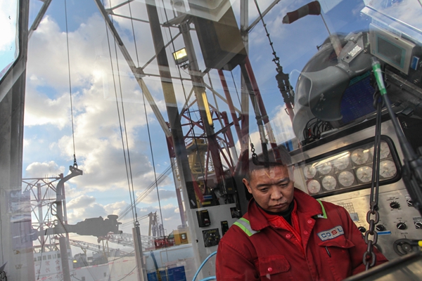 鉆臺上,鉆工們正與千斤鉆具“共舞”;司鉆房內,李軍義目不轉睛地盯著窗外的作業情況。“司鉆手上三條命,人命、船命和井命”是這位老司鉆的座右銘。