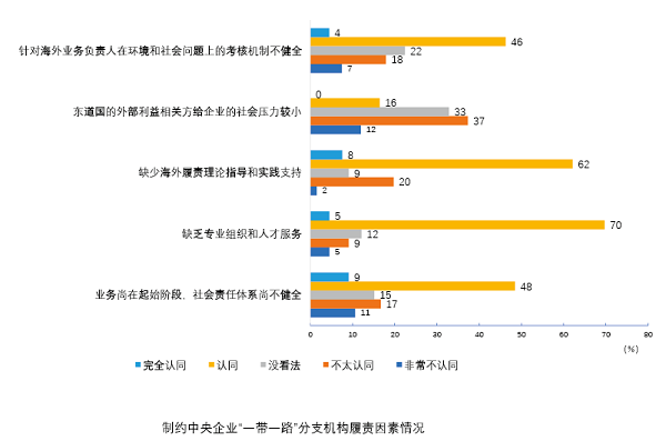 《藍皮書(shu)》的(de)(de)調查還顯示,在制(zhi)約(yue)中(zhong)央企(qi)業(ye)(ye)(ye)海外履(lv)責的(de)(de)因素中(zhong),有75%的(de)(de)中(zhong)央企(qi)業(ye)(ye)(ye)認(ren)為(wei)(wei)是(shi)缺乏專業(ye)(ye)(ye)組織(zhi)與人(ren)才服務,有70%的(de)(de)企(qi)業(ye)(ye)(ye)認(ren)為(wei)(wei)是(shi)缺少海外履(lv)責理(li)論(lun)指導(dao)和(he)實(shi)踐支(zhi)持,50%的(de)(de)中(zhong)央企(qi)業(ye)(ye)(ye)認(ren)同針對(dui)海外業(ye)(ye)(ye)務負(fu)責人(ren)在環境和(he)社會問題上(shang)的(de)(de)考(kao)核(he)機制(zhi)不健(jian)全。