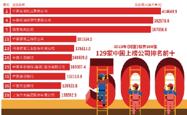 129家中國企業中,國有企業上榜總數為88家,由國務院國資委出資企業共有48家。其中,中國石化、中國石油、國家電網分列2019世界500強榜單的第二位、第四位、第五位。