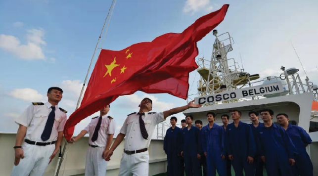 2016年以來,國企黨建工作步入了全新時代,基層黨建工作不斷加強。圖為中遠海運海員在船上舉行升旗儀式。