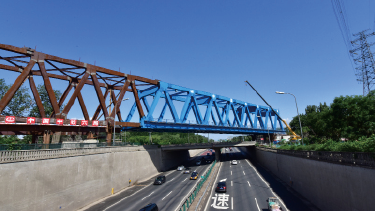 中國中鐵六局承建的京沈高鐵星火站樞紐站前工程鋼桁梁上跨北京市東五環。