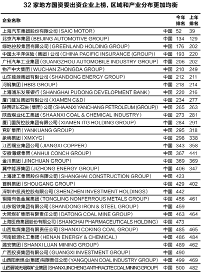 在(zai)(zai)今年(nian)上(shang)(shang)榜(bang)的地方國(guo)企(qi)(qi)中,排(pai)(pai)(pai)(pai)名第(di)一(yi)的依(yi)舊(jiu)是上(shang)(shang)汽(qi)集(ji)團(tuan)(tuan)。從區域看,上(shang)(shang)海市國(guo)資(zi)(zi)委(wei)(wei)監(jian)管(guan)(guan)的企(qi)(qi)業(ye)已有(you)6家上(shang)(shang)榜(bang),分別(bie)是上(shang)(shang)汽(qi)集(ji)團(tuan)(tuan)、綠(lv)地控股、太平洋保險(xian)、浦發銀行、上(shang)(shang)海建(jian)工、上(shang)(shang)海醫藥,總數(shu)位(wei)(wei)居各省市第(di)一(yi)。山(shan)(shan)(shan)西省國(guo)資(zi)(zi)委(wei)(wei)監(jian)管(guan)(guan)企(qi)(qi)業(ye)為(wei)5家,均(jun)為(wei)煤炭行業(ye)企(qi)(qi)業(ye)。山(shan)(shan)(shan)東(dong)省有(you)3家,分別(bie)是山(shan)(shan)(shan)東(dong)能(neng)源、兗(yan)礦集(ji)團(tuan)(tuan)、山(shan)(shan)(shan)東(dong)鋼鐵。值得一(yi)提的是,前不久(jiu),山(shan)(shan)(shan)東(dong)能(neng)源已經(jing)與兗(yan)礦集(ji)團(tuan)(tuan)合(he)并(bing)為(wei)新的山(shan)(shan)(shan)東(dong)能(neng)源,合(he)并(bing)后(hou)企(qi)(qi)業(ye)營收達到932.16億美元,可以排(pai)(pai)(pai)(pai)名總榜(bang)單第(di)81位(wei)(wei),在(zai)(zai)中國(guo)的上(shang)(shang)榜(bang)企(qi)(qi)業(ye)中,可以排(pai)(pai)(pai)(pai)在(zai)(zai)第(di)21位(wei)(wei)。此外(wai),排(pai)(pai)(pai)(pai)名435位(wei)(wei)的海爾是山(shan)(shan)(shan)東(dong)青島的一(yi)家集(ji)體所有(you)制(zhi)企(qi)(qi)業(ye)。《國(guo)資(zi)(zi)報告》記者還注意到,今年(nian)仍然有(you)3家廈(sha)門(men)(men)市國(guo)資(zi)(zi)委(wei)(wei)監(jian)管(guan)(guan)企(qi)(qi)業(ye)上(shang)(shang)榜(bang),分別(bie)是廈(sha)門(men)(men)建(jian)發、廈(sha)門(men)(men)國(guo)貿、象嶼集(ji)團(tuan)(tuan),且排(pai)(pai)(pai)(pai)名均(jun)在(zai)(zai)300名以內(nei);廣州國(guo)資(zi)(zi)委(wei)(wei)監(jian)管(guan)(guan)的廣汽(qi)集(ji)團(tuan)(tuan)排(pai)(pai)(pai)(pai)名為(wei)206位(wei)(wei);深圳市國(guo)資(zi)(zi)委(wei)(wei)出資(zi)(zi)的深圳投資(zi)(zi)管(guan)(guan)控首(shou)次上(shang)(shang)榜(bang),排(pai)(pai)(pai)(pai)名為(wei)442位(wei)(wei)。