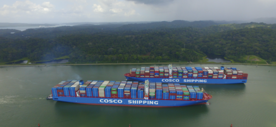 中遠海運從機關挑選一部分優秀年輕人上船當政委的做法得到了充分肯定。圖為2018年12月3日,中遠海運玫瑰輪與中遠海運牡丹輪在巴拿馬運河相遇。