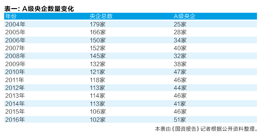 《國資報告》記(ji)者注意到,2016年的(de)A級企業(ye)共51家,占央企總(zong)數的(de)一半,比例達(da)到歷史最高。2015年,106家央企中,A級企業(ye)為(wei)46家。2004年的(de)179家央企中,A級央企僅為(wei)25家。具(ju)體見表一: