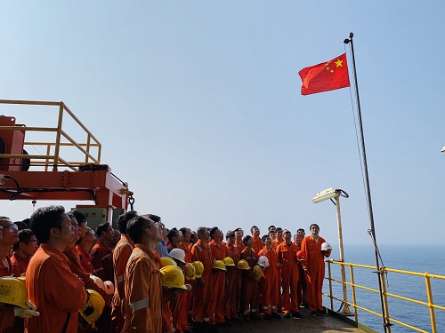 國(guo)(guo)慶(qing)(qing)長假(jia)期間,中國(guo)(guo)海油(you)陸豐13-2平(ping)臺(tai)100多名員工(gong)堅守崗位。10月1日,平(ping)臺(tai)合理安排作業,在確保各(ge)項作業平(ping)穩(wen)運行前提下,全體員工(gong)參(can)加(jia)升國(guo)(guo)旗并(bing)一起觀(guan)看國(guo)(guo)慶(qing)(qing)閱(yue)兵活動。