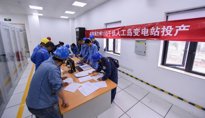 港珠澳大橋110千伏人工島變電站從11月15日上午開始投產操作,于16日9時完成全部變電設備充電,順利投產。周卓英 梁家豪 攝