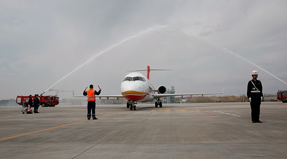 首次執飛成都航空EU2239航班的ARJ21飛機穿越水門