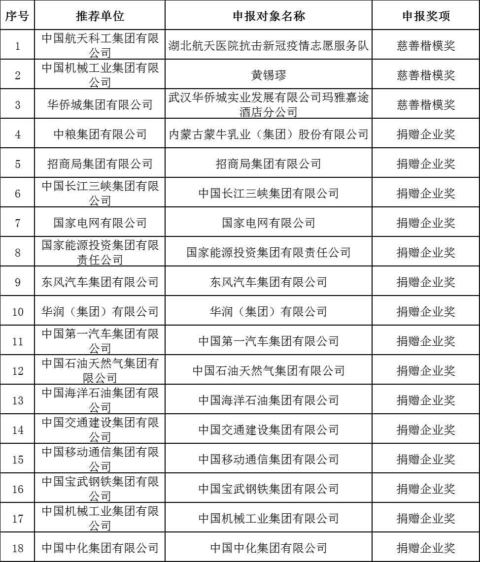 根據《民政(zheng)部(bu)關于(yu)開展第十一屆(jie)“中華(hua)慈(ci)善(shan)獎”評選(xuan)表彰活動的(de)(de)通知》(民函(han)〔2019〕91號(hao))和(he)《民政(zheng)部(bu)關于(yu)調整第十一屆(jie)“中華(hua)慈(ci)善(shan)獎”有關安排的(de)(de)通知》(民函(han)〔2020〕39號(hao))要求,現(xian)將國資委擬(ni)推(tui)(tui)薦的(de)(de)第十一屆(jie)“中華(hua)慈(ci)善(shan)獎”候(hou)(hou)選(xuan)對象名單(dan)公示如下,公示期為3天(tian)(2020年6月23日至2020年6月25日17:00)。其中,“擬(ni)補充推(tui)(tui)薦的(de)(de)候(hou)(hou)選(xuan)對象”是專門(men)針對在疫情期間發揮重要作用的(de)(de)慈(ci)善(shan)力量所推(tui)(tui)薦的(de)(de),與(yu)“擬(ni)推(tui)(tui)薦的(de)(de)候(hou)(hou)選(xuan)對象”相互獨立。