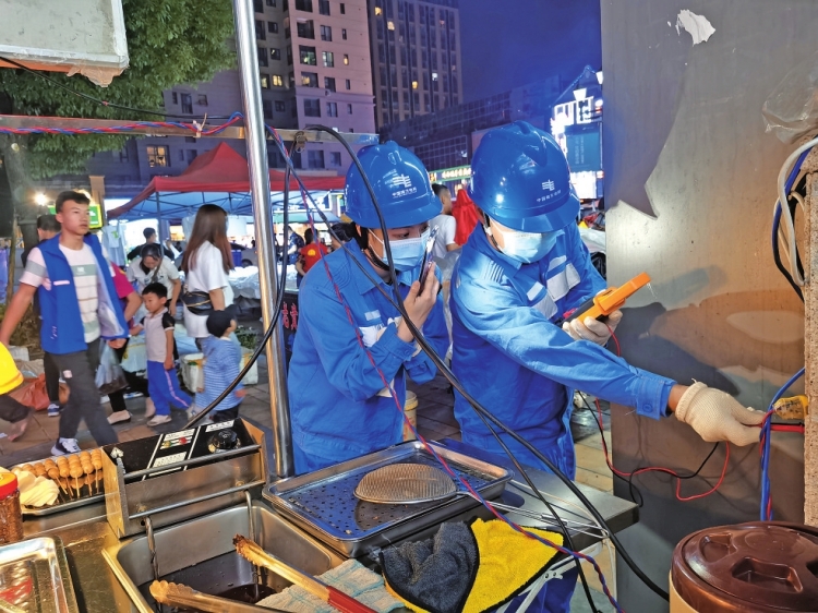 為保障地攤照明燈、廣告牌等設備的電力安全,南方電網貴州貴陽小河供電局工作人員穿梭在步行街,依次檢查各攤位電源線路是否安全,提醒攤販們雨季注意電力線路防水絕緣,安全第一。
