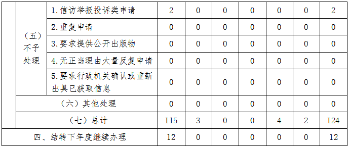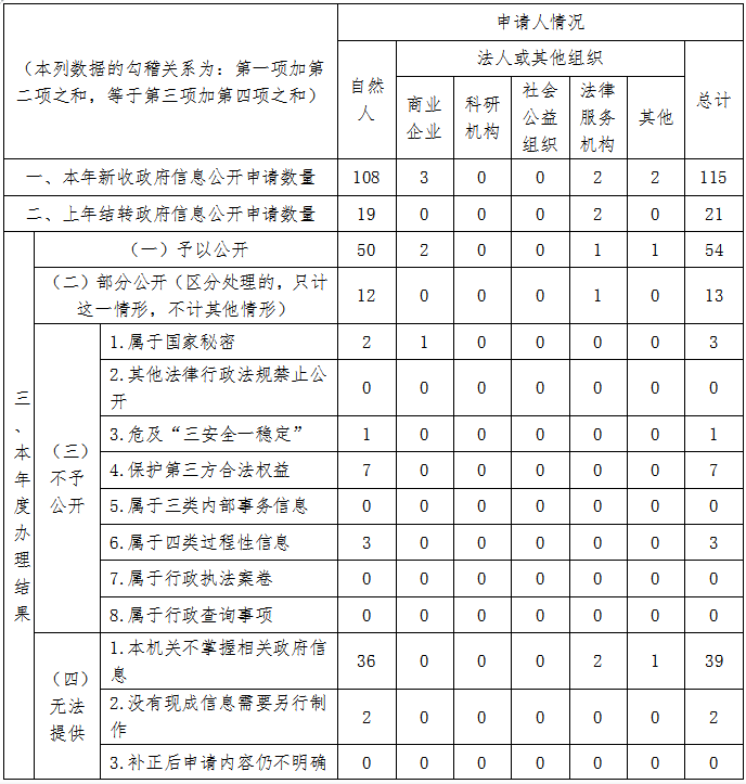 本年度共收到信息公開申(shen)請(qing)115件(jian)(jian),上(shang)年度結轉21件(jian)(jian),已(yi)按規定(ding)辦結124件(jian)(jian),結轉下年度辦理12件(jian)(jian)。已(yi)辦結的申(shen)請(qing)中,予(yu)以(yi)公開54件(jian)(jian)、部(bu)分公開13件(jian)(jian)、不予(yu)公開14件(jian)(jian)、無法提供(gong)41件(jian)(jian)、不予(yu)處理2件(jian)(jian)(詳見“收到和處理政(zheng)府信息公開申(shen)請(qing)情況”)。
