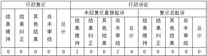 因信(xin)息(xi)公開被申請行(xing)(xing)(xing)政復(fu)(fu)議(yi)0件(jian)(jian)、提起行(xing)(xing)(xing)政訴訟4件(jian)(jian)。提起的行(xing)(xing)(xing)政訴訟,均(jun)為未經復(fu)(fu)議(yi)直(zhi)接起訴件(jian)(jian),其中結(jie)果維持2件(jian)(jian),尚(shang)未審結(jie)2件(jian)(jian)。