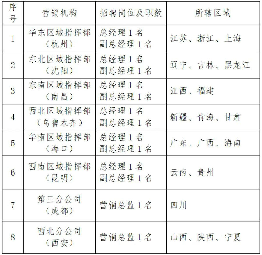 為推進(jin)公司“三年(nian)五年(nian)規劃(hua)、十(shi)(shi)年(nian)三十(shi)(shi)年(nian)愿景目標”中長期(qi)發展戰(zhan)略(lve),全面深化(hua)改革,創(chuang)新(xin)管理體制,根據(ju)工(gong)作需要(yao),擬公開招聘市場營銷區(qu)域(yu)機構負責人,現將有關事項(xiang)公告如下: