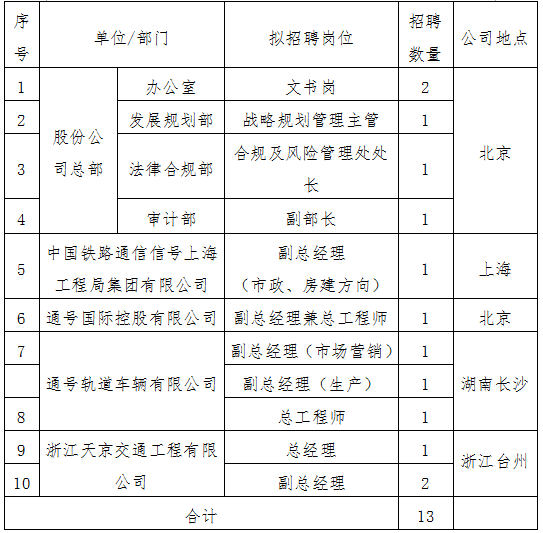 此次招(zhao)(zhao)聘是中國通號面向全(quan)社(she)會(hui)進行的公(gong)(gong)(gong)開招(zhao)(zhao)聘,將秉持公(gong)(gong)(gong)開、公(gong)(gong)(gong)平(ping)、公(gong)(gong)(gong)正的原則(ze)在公(gong)(gong)(gong)司(si)內(nei)外廣(guang)納(na)賢才,股份(fen)公(gong)(gong)(gong)司(si)內(nei)部、外部人員均可報名應聘。