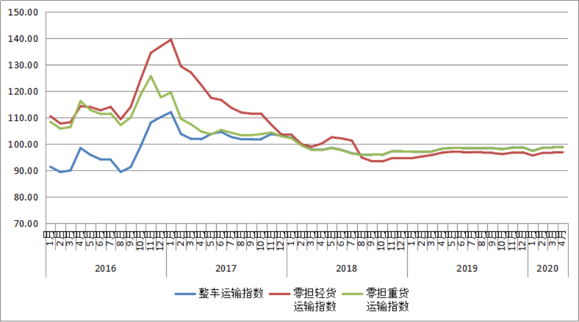 2020年4月(yue)(yue)份,由(you)中國(guo)物(wu)流與采購聯合(he)會和林安物(wu)流集團聯合(he)調查的中國(guo)公路物(wu)流運價指數為98.5點,與上(shang)月(yue)(yue)相比(bi)基(ji)本持(chi)平(ping),比(bi)去(qu)年同(tong)期增長(chang)0.6%。月(yue)(yue)內各周(zhou)指數總體平(ping)穩(wen),其中第一(yi)、三、四(si)周(zhou)環比(bi)回升(sheng),第二周(zhou)環比(bi)回落。