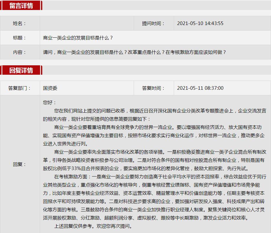 2021年5月國資委網站政務咨詢欄目部分網友提出的咨詢,我們初步做出了認真的回應,現選擇五條關注度高、點擊量高的問題,再次推薦分享。