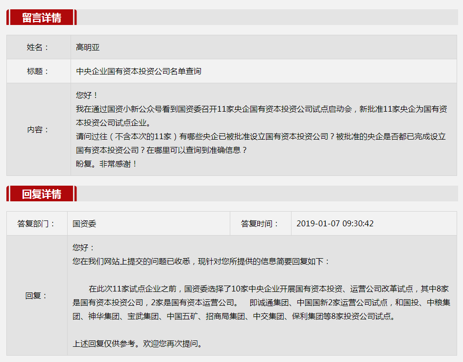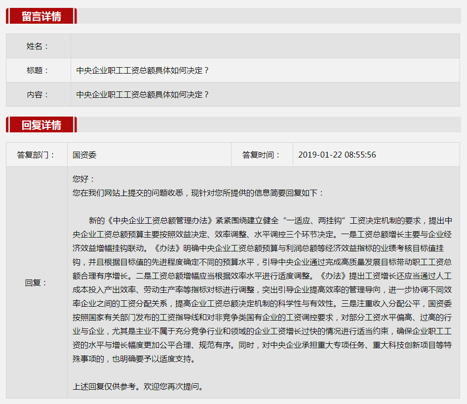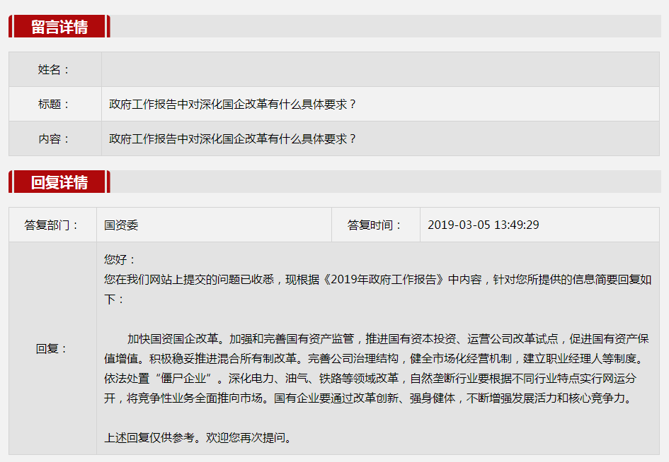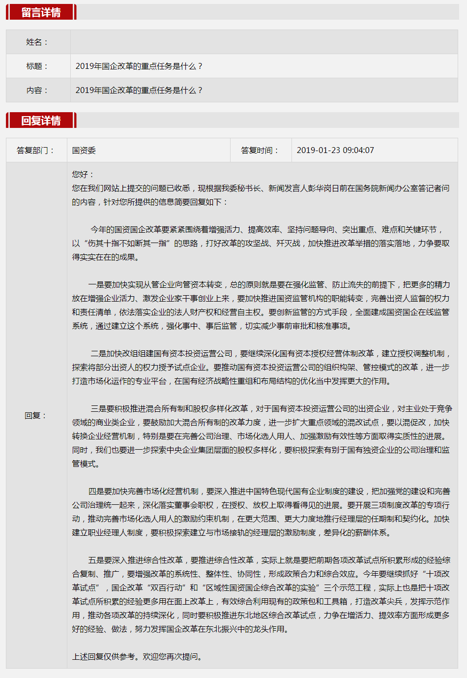 第一季(ji)度國(guo)資委(wei)網(wang)站政務咨(zi)詢欄(lan)目部分(fen)網(wang)友提出(chu)的(de)(de)(de)咨(zi)詢,我們初步做出(chu)了認真(zhen)的(de)(de)(de)回(hui)應,現(xian)選擇五條關注度高(gao)、點擊量高(gao)的(de)(de)(de)問題,再(zai)次推薦分(fen)享。這里有你關心的(de)(de)(de)話(hua)題,快來看看廣(guang)大網(wang)友用鍵盤(pan)推出(chu)的(de)(de)(de)熱(re)門話(hua)題吧。