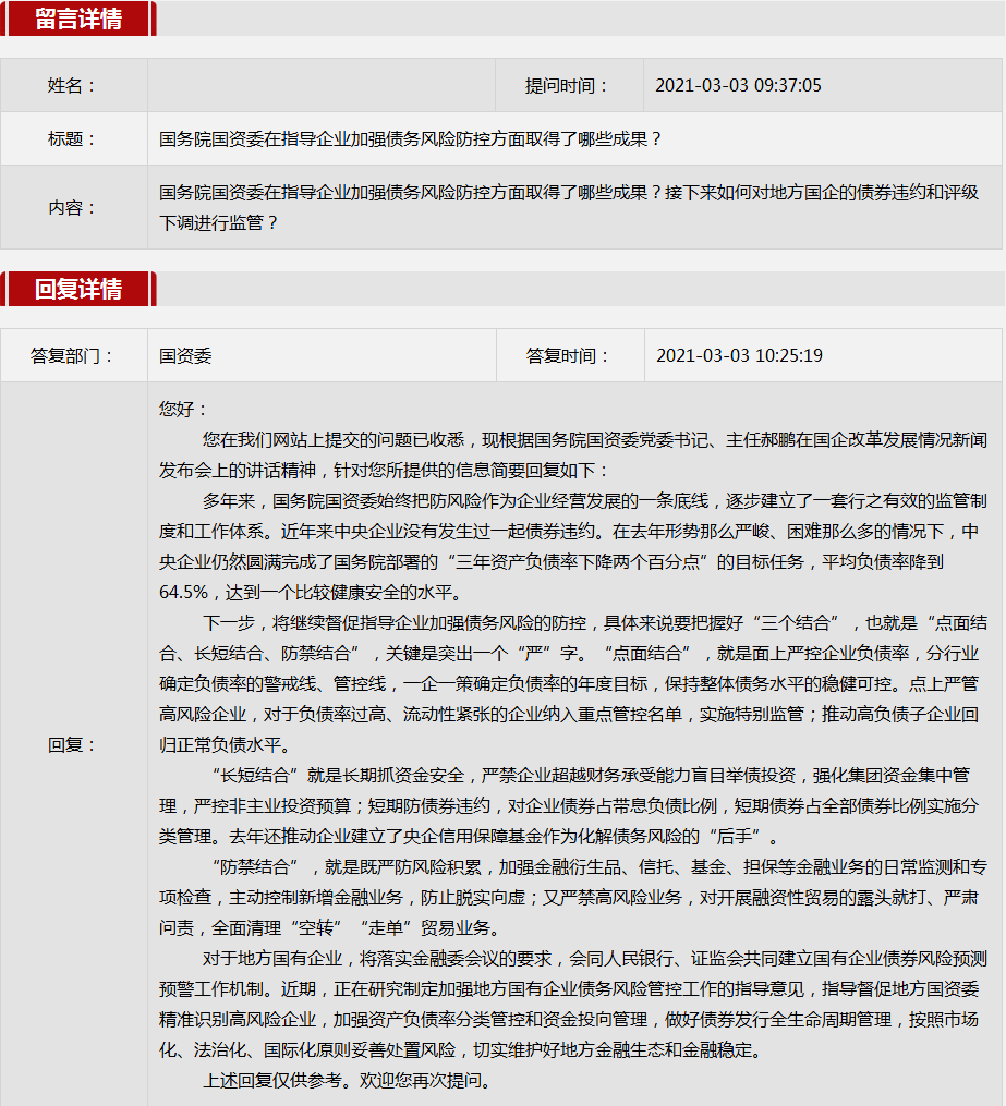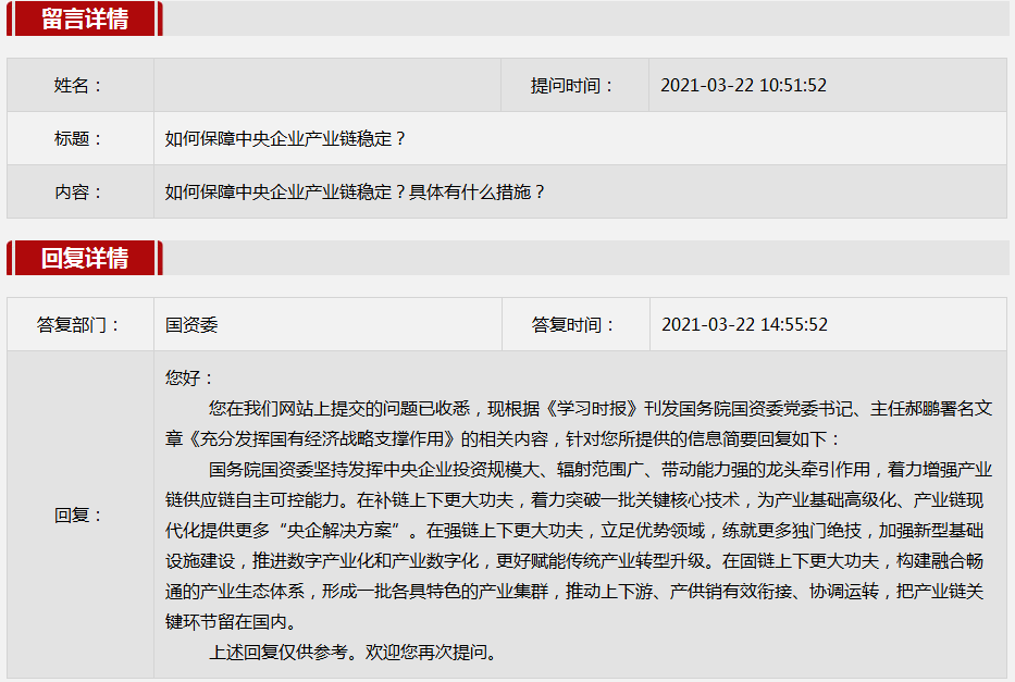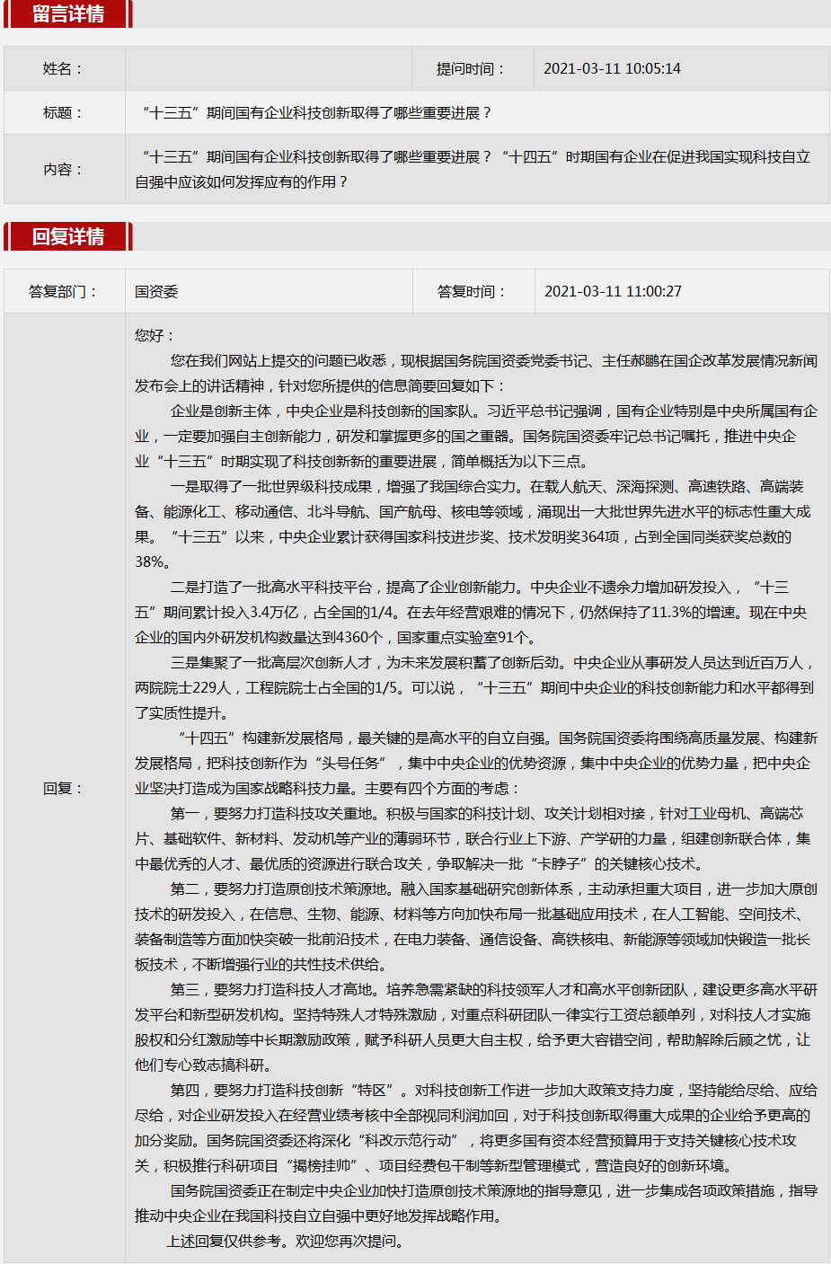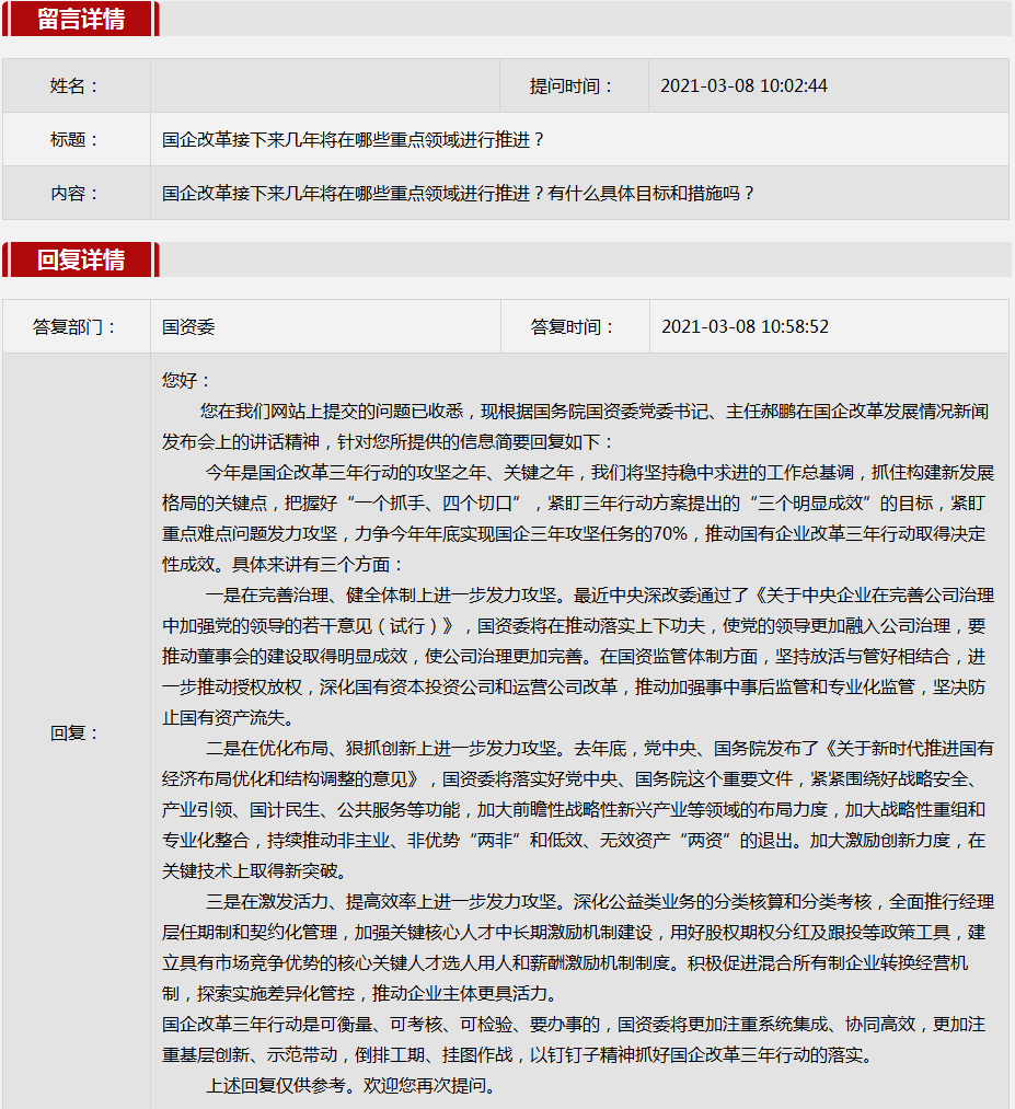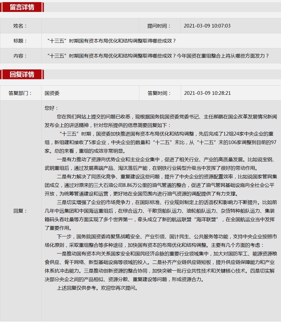 2021年3月國資委網站(zhan)政務(wu)咨詢(xun)欄目部分(fen)(fen)網友提出(chu)的咨詢(xun),我(wo)們初步(bu)做出(chu)了認真(zhen)的回應,現選擇五(wu)條關(guan)注度(du)高(gao)、點擊量高(gao)的問題,再次(ci)推(tui)薦分(fen)(fen)享。