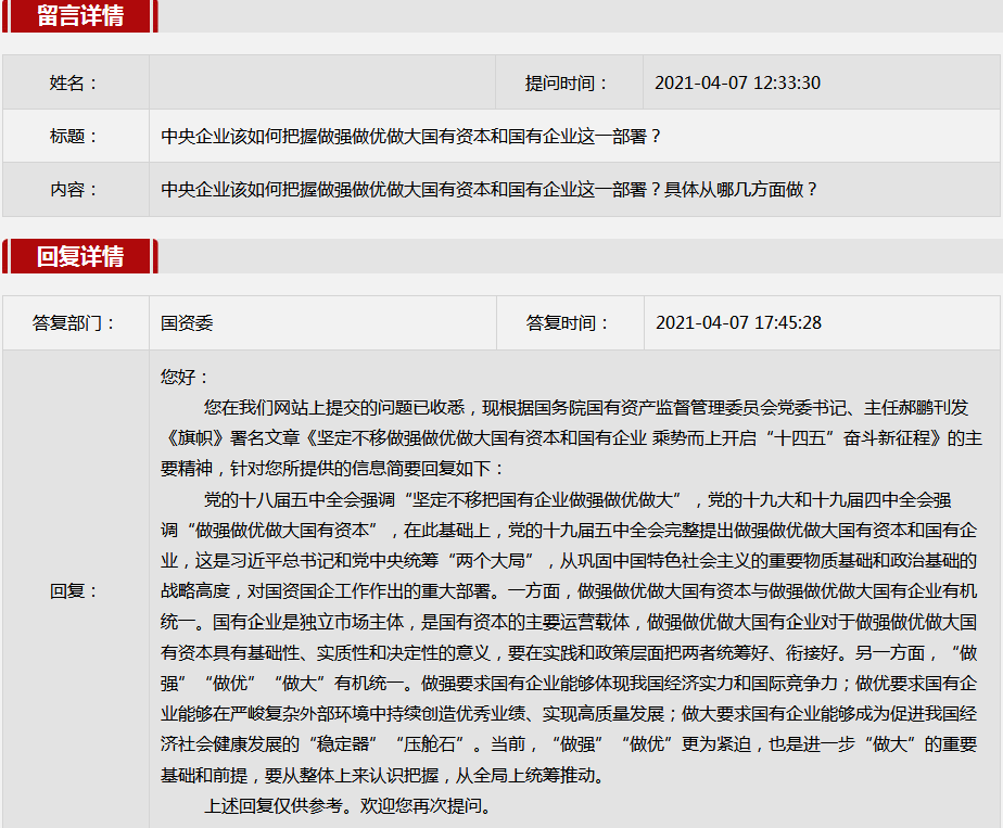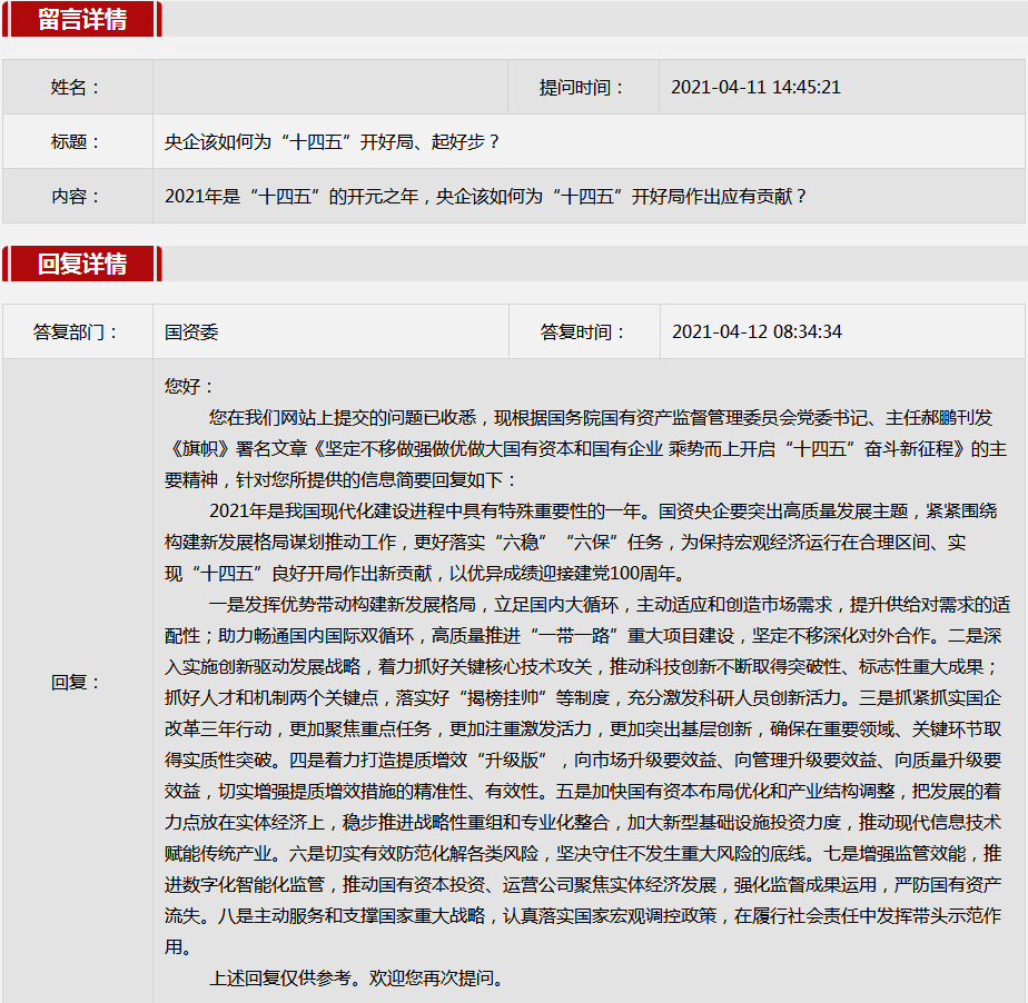 2021年4月國資委網站政務咨詢欄目部分網友提出的咨詢,我們初步做出了認真的回應,現選擇五條關注度高、點擊量高的問題,再次推薦分享。
