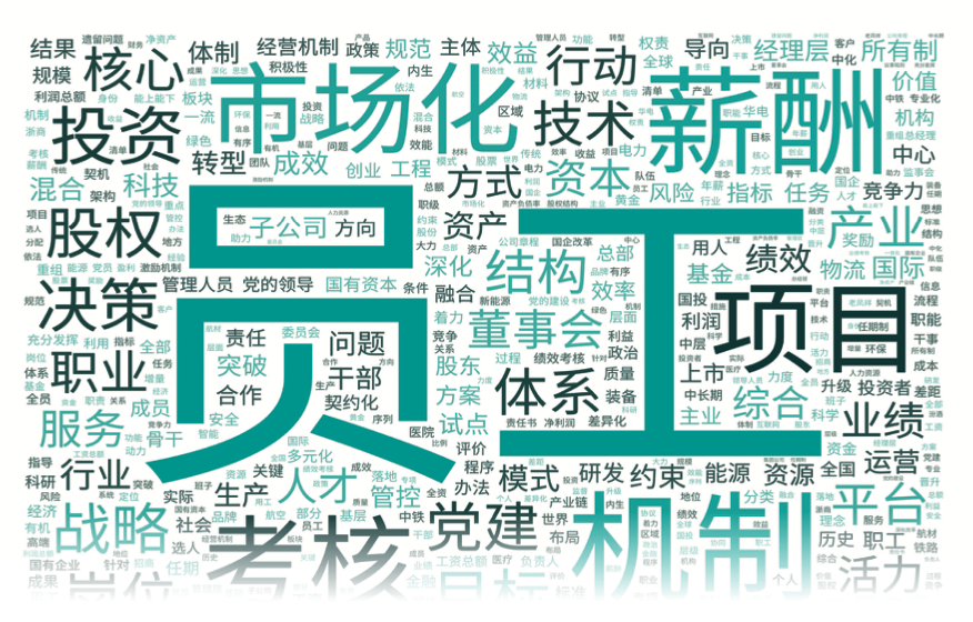 去掉詞(ci)頻(pin)(pin)出現(xian)最(zui)高(gao)的“企(qi)業、公司、發展、改革、經營、管理、集團、工作”等相(xiang)對(dui)抽(chou)象的詞(ci)匯,出現(xian)頻(pin)(pin)次(ci)最(zui)多的詞(ci)是員工(906次(ci))、市場化(883次(ci))、機制(875次(ci))等。