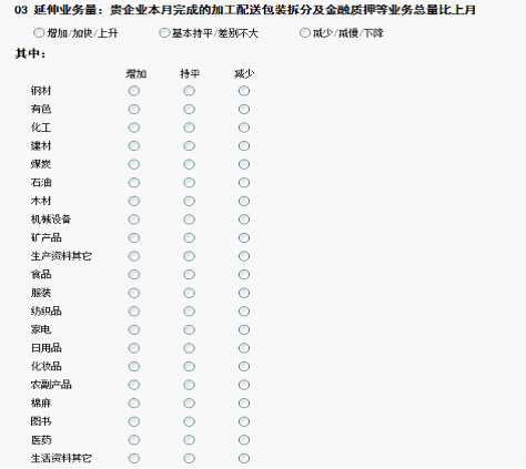 在中(zhong)國倉(cang)儲(chu)(chu)指(zhi)(zhi)數(shu)體系中(zhong),除了(le)(le)上述全國11個(ge)分(fen)(fen)項指(zhi)(zhi)數(shu)外,指(zhi)(zhi)數(shu)體系還包括了(le)(le)按(an)(an)產品分(fen)(fen)類(lei)的(de)各(ge)品種倉(cang)儲(chu)(chu)指(zhi)(zhi)數(shu);按(an)(an)地區分(fen)(fen)類(lei)的(de)各(ge)區域(yu)倉(cang)儲(chu)(chu)指(zhi)(zhi)數(shu);按(an)(an)企業倉(cang)庫面積分(fen)(fen)類(lei)的(de)各(ge)規模企業的(de)倉(cang)儲(chu)(chu)指(zhi)(zhi)數(shu),共同(tong)構成中(zhong)國倉(cang)儲(chu)(chu)指(zhi)(zhi)數(shu)體系。