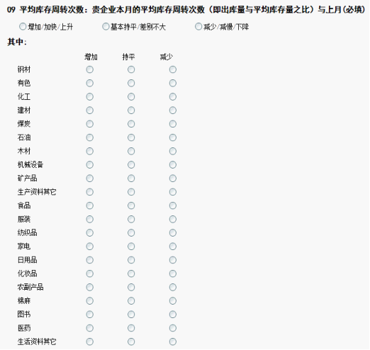 由(you)21類(lei)(lei)商(shang)品(pin)組成的2018年10月(yue)期末(mo)庫(ku)(ku)存指數為(wei)51.4%,較(jiao)(jiao)上(shang)月(yue)回升(sheng)3.3個百分點,庫(ku)(ku)存水(shui)平較(jiao)(jiao)前期明顯回升(sheng)。分品(pin)種(zhong)來看(kan),生產資料類(lei)(lei)商(shang)品(pin)中(zhong),鋼材、有(you)色、化工等商(shang)品(pin)庫(ku)(ku)存較(jiao)(jiao)上(shang)月(yue)有(you)較(jiao)(jiao)大幅(fu)度(du)回升(sheng),建(jian)材、石油、機(ji)械(xie)設備等商(shang)品(pin)庫(ku)(ku)存較(jiao)(jiao)上(shang)月(yue)有(you)所回落;生活資料類(lei)(lei)商(shang)品(pin)中(zhong),紡(fang)織品(pin)、家電類(lei)(lei)商(shang)品(pin)庫(ku)(ku)存較(jiao)(jiao)上(shang)月(yue)有(you)所下降。