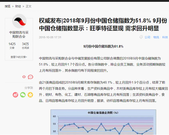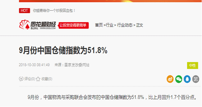 2018年10月中國倉儲指數為51.7%