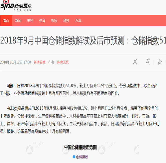 中(zhong)(zhong)國物流與采購聯合會和(he)中(zhong)(zhong)儲(chu)發展股份有限公(gong)司聯合調(diao)查(cha)的中(zhong)(zhong)國倉儲(chu)指(zhi)數(shu),2018年10月(yue)份為(wei)51.7%,較上(shang)月(yue)回落0.1個百(bai)分點,各分項(xiang)指(zhi)數(shu)均保持在(zai)50%以上(shang)。指(zhi)數(shu)連續三個月(yue)保持在(zai)擴(kuo)張(zhang)區間(jian),雖然本(ben)月(yue)擴(kuo)張(zhang)節(jie)奏略(lve)有放緩(huan),但整體仍延(yan)續了較為(wei)明顯的旺季特征(zheng),需求保持增長(chang),周轉效率加快,庫存(cun)水平(ping)回升,行業平(ping)穩(wen)向好的基礎較為(wei)穩(wen)固。具體來(lai)看,有以下(xia)幾個特點: