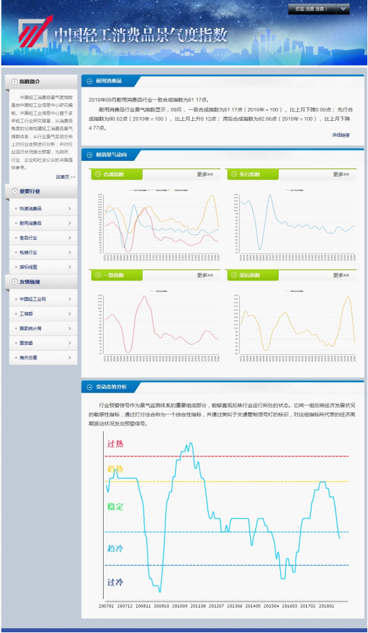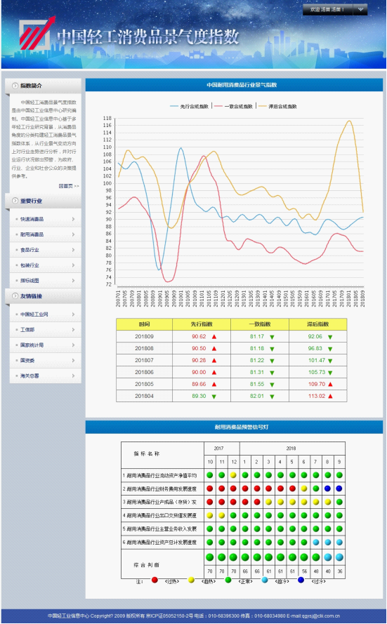 中國(guo)輕工(gong)(gong)消(xiao)(xiao)費(fei)(fei)品(pin)(pin)景氣(qi)度指數的發布,是在國(guo)務院馬凱副總理2015年12月24日(ri)(ri)在聽取輕工(gong)(gong)行(xing)(xing)業(ye)(ye)情況匯報時,對輕工(gong)(gong)行(xing)(xing)業(ye)(ye)重新(xin)劃(hua)分(fen)(fen)的六大類別給(gei)予了充分(fen)(fen)肯定。并指示說:“這個分(fen)(fen)類好。經濟運行(xing)(xing)分(fen)(fen)析(xi)不能只搞總量分(fen)(fen)析(xi),要做(zuo)結(jie)構化分(fen)(fen)析(xi)。”的指引下(xia),我們按輕工(gong)(gong)行(xing)(xing)業(ye)(ye)分(fen)(fen)類體(ti)系現行(xing)(xing)的國(guo)民經濟標準分(fen)(fen)類體(ti)系重新(xin)整合,將(jiang)輕工(gong)(gong)行(xing)(xing)業(ye)(ye)劃(hua)分(fen)(fen)為六大類別即快(kuai)速(su)消(xiao)(xiao)費(fei)(fei)品(pin)(pin)、耐用(yong)消(xiao)(xiao)費(fei)(fei)品(pin)(pin)、日(ri)(ri)用(yong)消(xiao)(xiao)費(fei)(fei)品(pin)(pin)、文(wen)體(ti)休(xiu)閑用(yong)品(pin)(pin)、原料(liao)產品(pin)(pin)、輕工(gong)(gong)機械裝備(bei)。根據輕工(gong)(gong)行(xing)(xing)業(ye)(ye)六大類別,將(jiang)快(kuai)速(su)消(xiao)(xiao)費(fei)(fei)品(pin)(pin)指數、耐用(yong)消(xiao)(xiao)費(fei)(fei)品(pin)(pin)指數、日(ri)(ri)用(yong)消(xiao)(xiao)費(fei)(fei)品(pin)(pin)指數和文(wen)體(ti)休(xiu)閑用(yong)品(pin)(pin)指數加權綜合,構建(jian)中國(guo)輕工(gong)(gong)消(xiao)(xiao)費(fei)(fei)品(pin)(pin)景氣(qi)指數指標體(ti)系。輕工(gong)(gong)消(xiao)(xiao)費(fei)(fei)品(pin)(pin)指數體(ti)系力求從(cong)行(xing)(xing)業(ye)(ye)景氣(qi)變動方(fang)向上對行(xing)(xing)業(ye)(ye)走勢進行(xing)(xing)結(jie)構化的分(fen)(fen)析(xi),并對行(xing)(xing)業(ye)(ye)運行(xing)(xing)狀況做(zuo)出預警,為政府、行(xing)(xing)業(ye)(ye)、企(qi)業(ye)(ye)和社會大眾的決策提(ti)供(gong)參考(kao)。