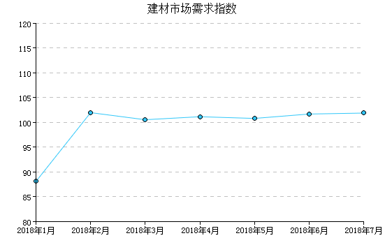 2018年7月(yue),建(jian)材市場需求指數(shu)為101.90,比(bi)(bi)上(shang)月(yue)增加(jia)0.20,比(bi)(bi)去(qu)年同月(yue)減(jian)少3.91。圖(tu) 6:建(jian)材市場需求指數(shu)