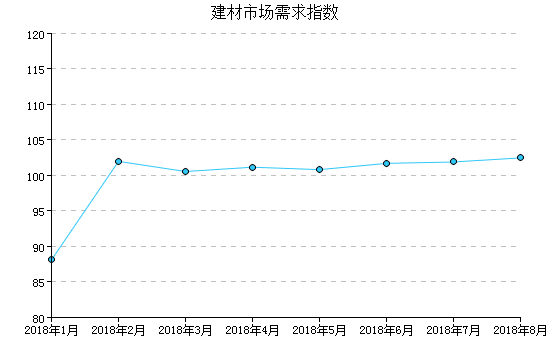 2018年8月(yue),建材市場需(xu)求指(zhi)數為102.48,比上月(yue)增加0.58,比去年同月(yue)減少1.91。