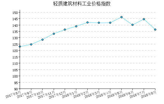 2018年8月,輕質建(jian)(jian)筑材(cai)料工業產品出廠價(jia)格指數(shu)為136.46,比上月下降5.65%,比去年同月上漲10.91%,一(yi)月至本月平均比去年同期上漲20.33%。 圖 1:輕質建(jian)(jian)筑材(cai)料工業產品出廠價(jia)格指數(shu)