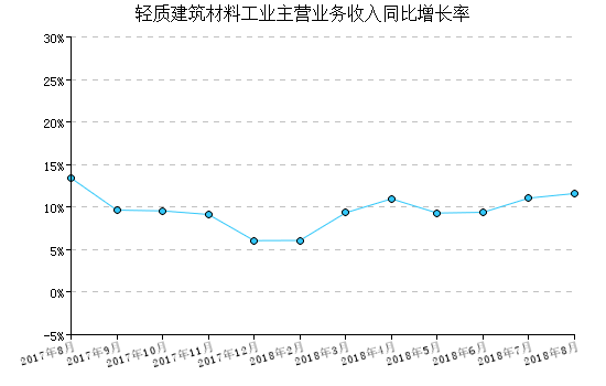 本月全國輕質建筑材料工業產量同比去年同月增長5.80%,累計增速比上月增長54.07%。