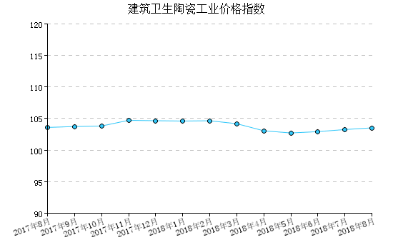 2018年(nian)8月(yue),建筑衛生陶(tao)瓷(ci)(ci)工業產品(pin)出廠價格指(zhi)數(shu)為103.53,比上(shang)月(yue)上(shang)漲0.26%,比去(qu)年(nian)同(tong)月(yue)下降0.07%,一(yi)月(yue)至本(ben)月(yue)平均比去(qu)年(nian)同(tong)期上(shang)漲0.10%。 圖 1:建筑衛生陶(tao)瓷(ci)(ci)工業產品(pin)出廠價格指(zhi)數(shu)