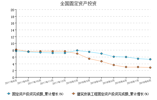 2018年8月全(quan)國固定資(zi)(zi)產投(tou)資(zi)(zi)累計增速增長(chang)5.3%,其中建筑安裝工程投(tou)資(zi)(zi)累計增速增長(chang)2.9%。 圖 4:全(quan)國固定資(zi)(zi)產投(tou)資(zi)(zi)情況