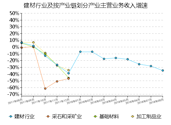 2018年8月規(gui)模以上(shang)工(gong)業(ye)(ye)增(zeng)(zeng)(zeng)(zeng)加(jia)值同比(bi)增(zeng)(zeng)(zeng)(zeng)長6.10%,累計增(zeng)(zeng)(zeng)(zeng)長增(zeng)(zeng)(zeng)(zeng)長6.50%。 跟(gen)其他工(gong)業(ye)(ye)行業(ye)(ye)相比(bi),建材行業(ye)(ye)增(zeng)(zeng)(zeng)(zeng)加(jia)值增(zeng)(zeng)(zeng)(zeng)速低于設備制(zhi)造、電器機械和(he)器材制(zhi)造、電力、熱力生產及供應等行業(ye)(ye),高(gao)于化(hua)學原料和(he)化(hua)學品制(zhi)造、黑色(se)金屬(shu)冶煉和(he)壓(ya)延(yan)、有所金屬(shu)冶煉和(he)壓(ya)延(yan)等行業(ye)(ye)。