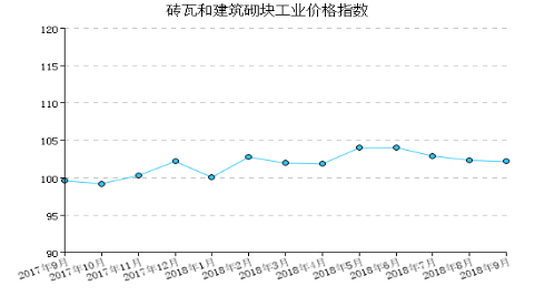 2018年(nian)9月,磚瓦和(he)建筑(zhu)砌塊工業(ye)產品(pin)出廠(chang)價格指數(shu)為102.17,比(bi)上(shang)月下降0.16%,比(bi)去年(nian)同月上(shang)漲2.60%,一月至本月平均比(bi)去年(nian)同期上(shang)漲2.72%。