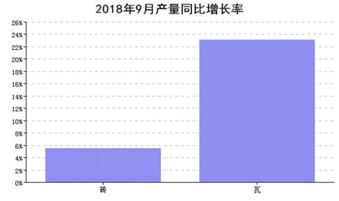 2018年9月規(gui)模以上工(gong)業(ye)(ye)增(zeng)加(jia)值同比增(zeng)長5.80%,累計增(zeng)長增(zeng)長6.40%。 跟其他工(gong)業(ye)(ye)行(xing)業(ye)(ye)相比,建(jian)材行(xing)業(ye)(ye)增(zeng)加(jia)值增(zeng)速低于設備制(zhi)(zhi)造(zao)、電器(qi)機械和(he)(he)器(qi)材制(zhi)(zhi)造(zao)、電力、熱力生產及供應(ying)等(deng)行(xing)業(ye)(ye),高于化學原料(liao)和(he)(he)化學品制(zhi)(zhi)造(zao)、黑色金屬(shu)(shu)冶煉和(he)(he)壓延、有所(suo)金屬(shu)(shu)冶煉和(he)(he)壓延等(deng)行(xing)業(ye)(ye)。