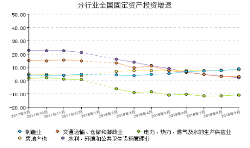 分行業來看:房地產業累計投資增速增長8個百分點;水利、環境和公共設施投資增速增長2個百分點;交通運輸、倉儲和郵政業投資增速增長3個百分點;制造業投資增速增長9個百分點。