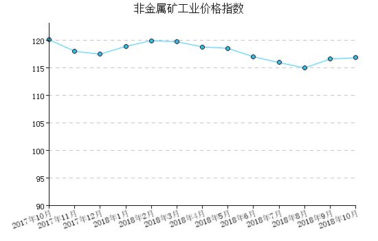2018年(nian)10月(yue),非金(jin)屬礦工(gong)業產品出廠(chang)價(jia)格指數為116.89,比(bi)上(shang)月(yue)上(shang)漲0.22%,比(bi)去年(nian)同月(yue)下降2.73%,一(yi)月(yue)至本月(yue)平均比(bi)去年(nian)同期上(shang)漲9.51%。