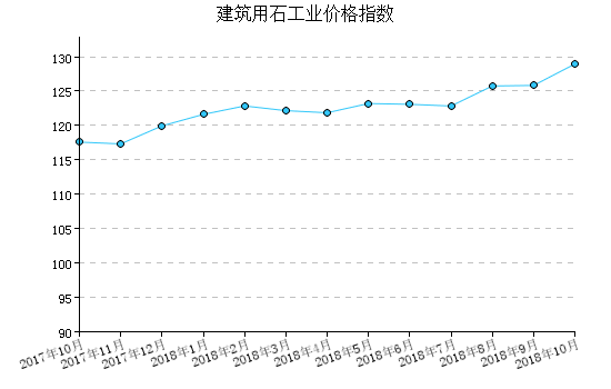 2018年(nian)10月(yue)(yue),建筑用石工(gong)業產品出廠價格指(zhi)數(shu)為128.94,比(bi)(bi)上月(yue)(yue)上漲2.48%,比(bi)(bi)去年(nian)同月(yue)(yue)上漲9.66%,一月(yue)(yue)至本月(yue)(yue)平均比(bi)(bi)去年(nian)同期上漲10.00%。