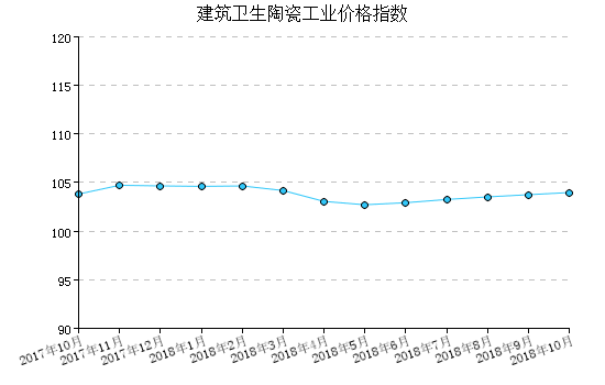 2018年10月,建筑衛(wei)生陶瓷工業產(chan)品出廠價(jia)格(ge)指數為103.97,比(bi)上(shang)月上(shang)漲0.21%,比(bi)去年同月上(shang)漲0.15%,一月至本月平(ping)均比(bi)去年同期上(shang)漲0.09%。